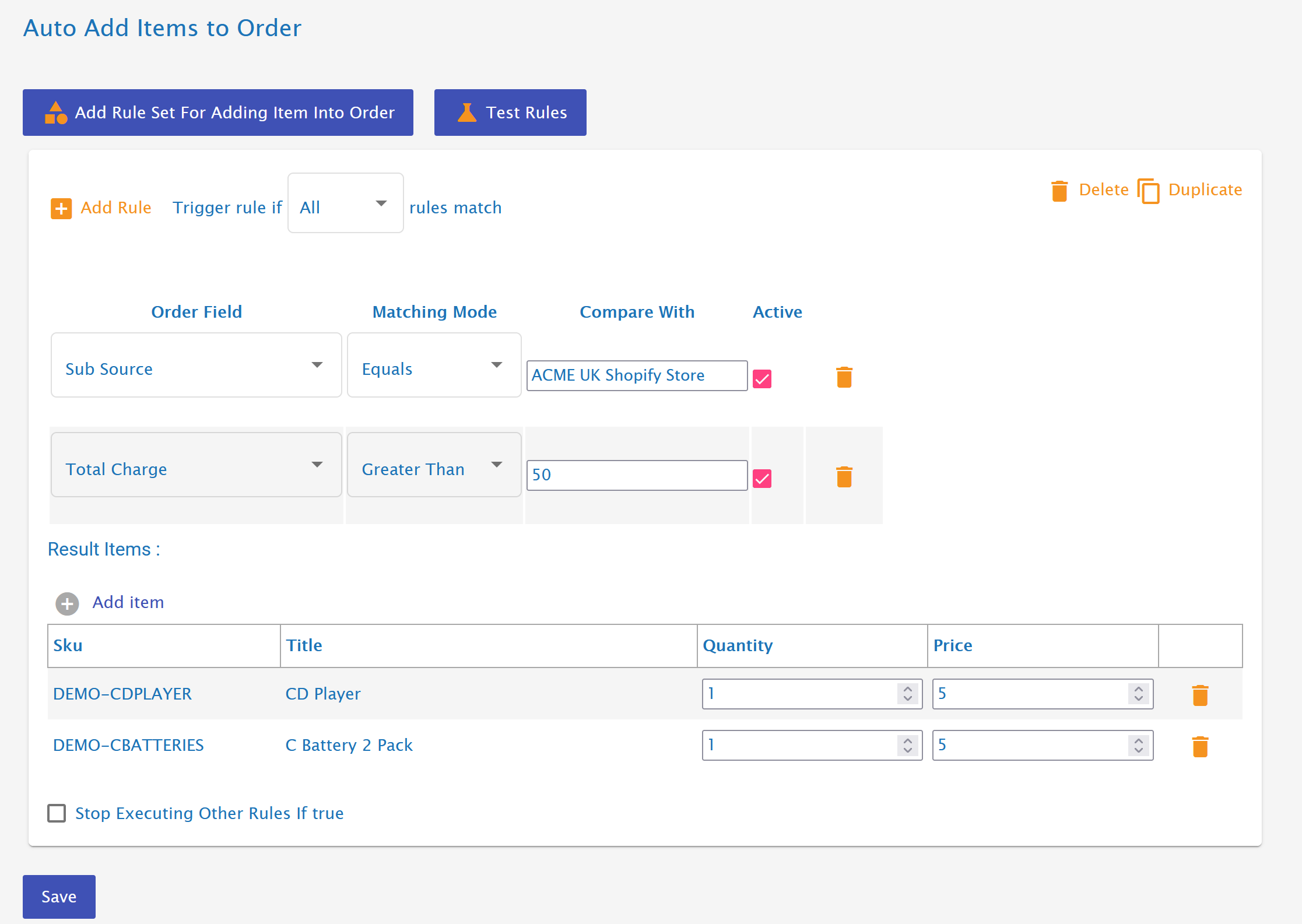 In the example below, an order from 'ACME UK Shopify Store' with an order value over Β£50* will have a CD player and batteries added to the order for free.