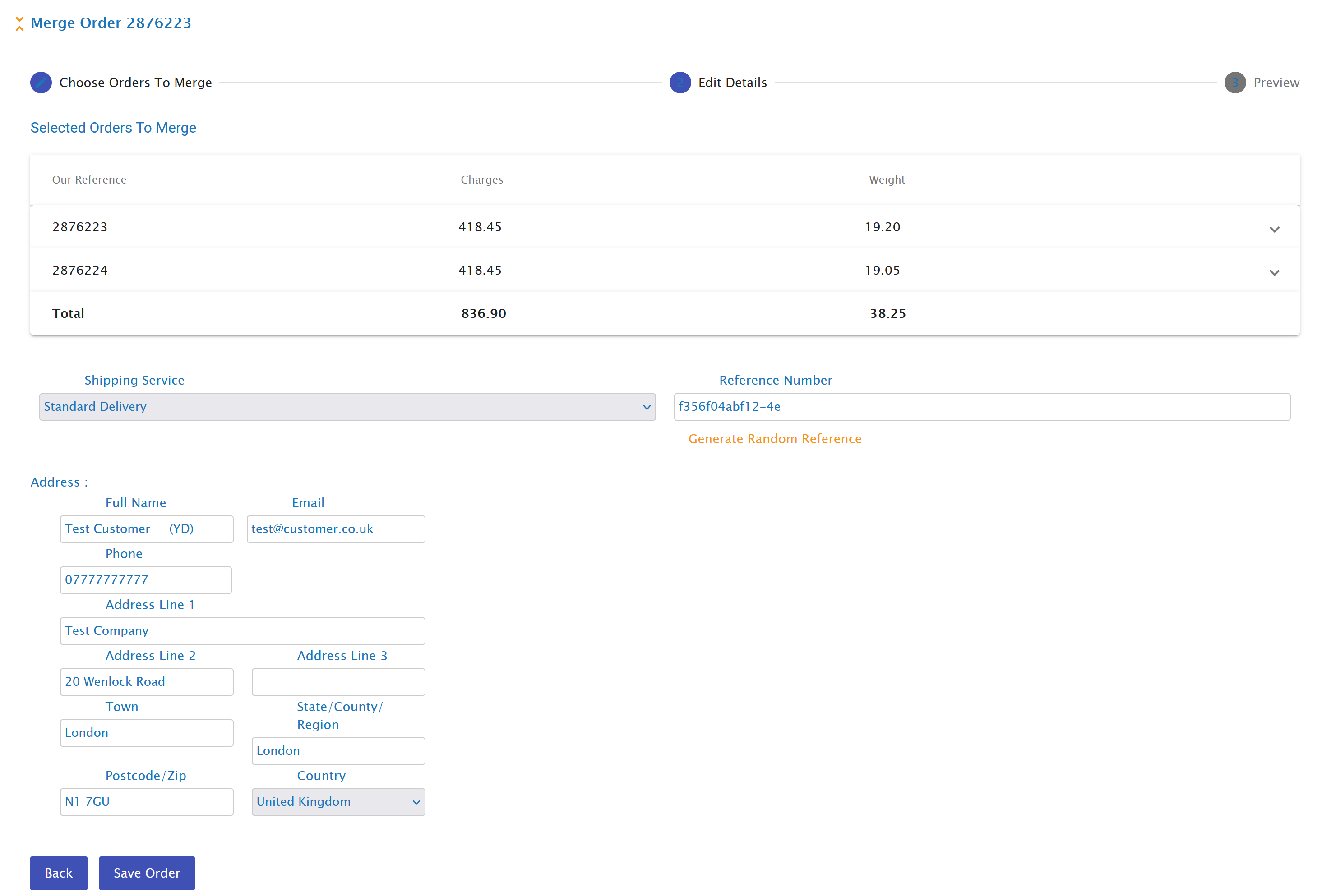 During the merge process, you can choose a new shipping service and define the reference for the new merged order.